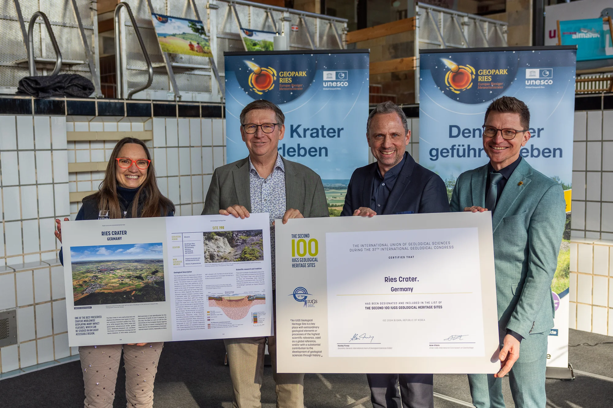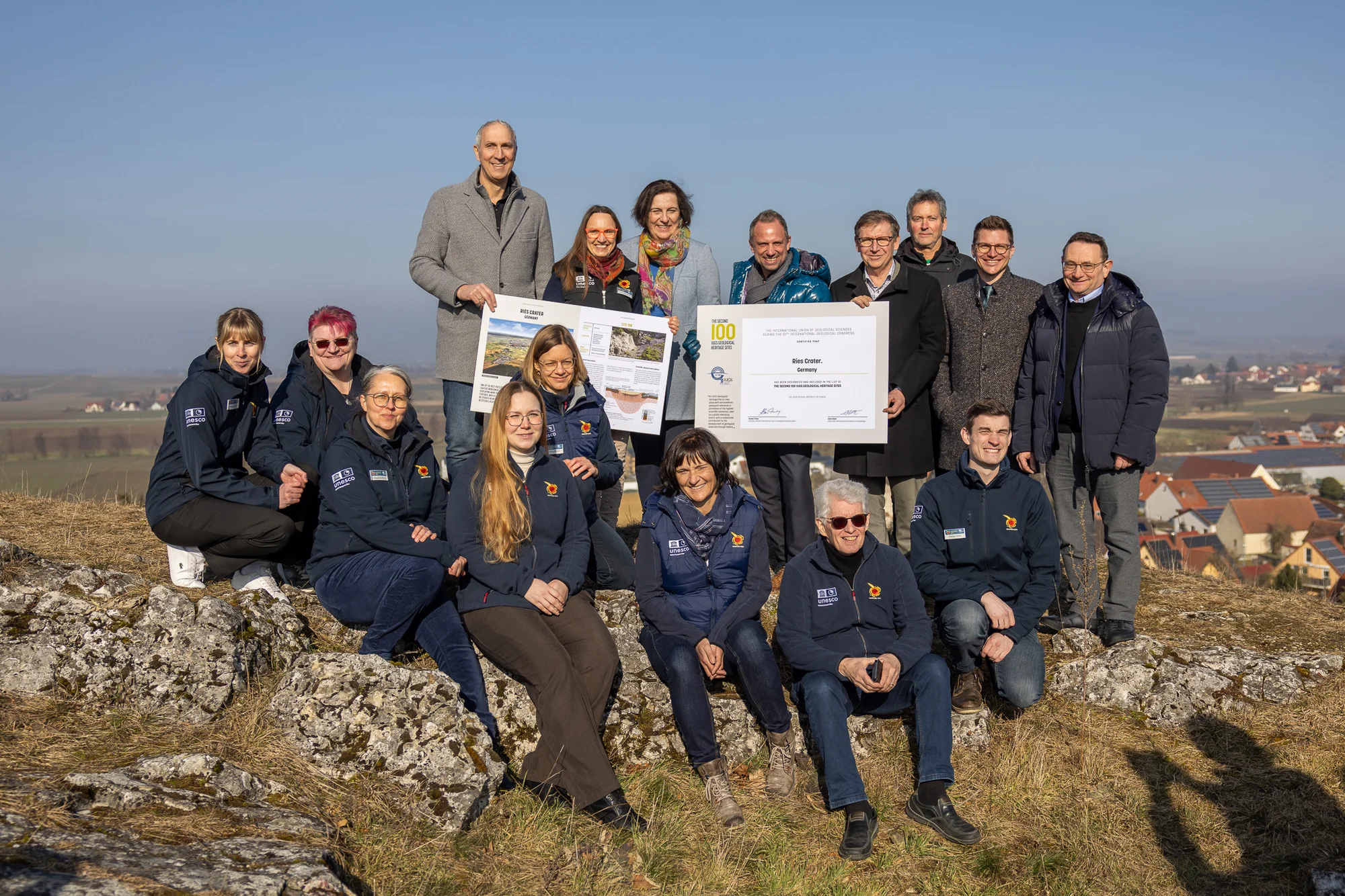 Wir freuen und RIESig! Das Rieskrater wurde von der Weltorganisation für Geowissenschaften, der International Union of Geological Sciences (IUGS), in die Liste der weltweit bedeutendsten geologischen Stätten aufgenommen! Damit steht das Nördlinger Ries auf einer Stufe z. B. mit dem Vesuv, dem Yosemite Valley oder der Etosha-Pfanne. Die Auszeichnung wurde von Bayerns Umweltminister Thorsten Glauber im UNESCO Global Geopark Ries überreicht.