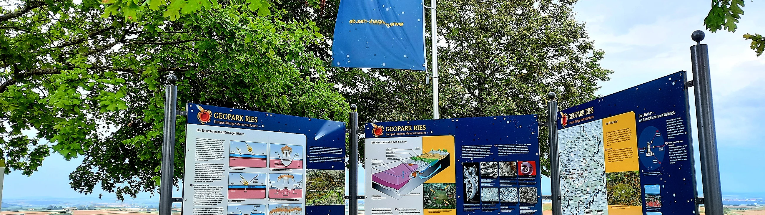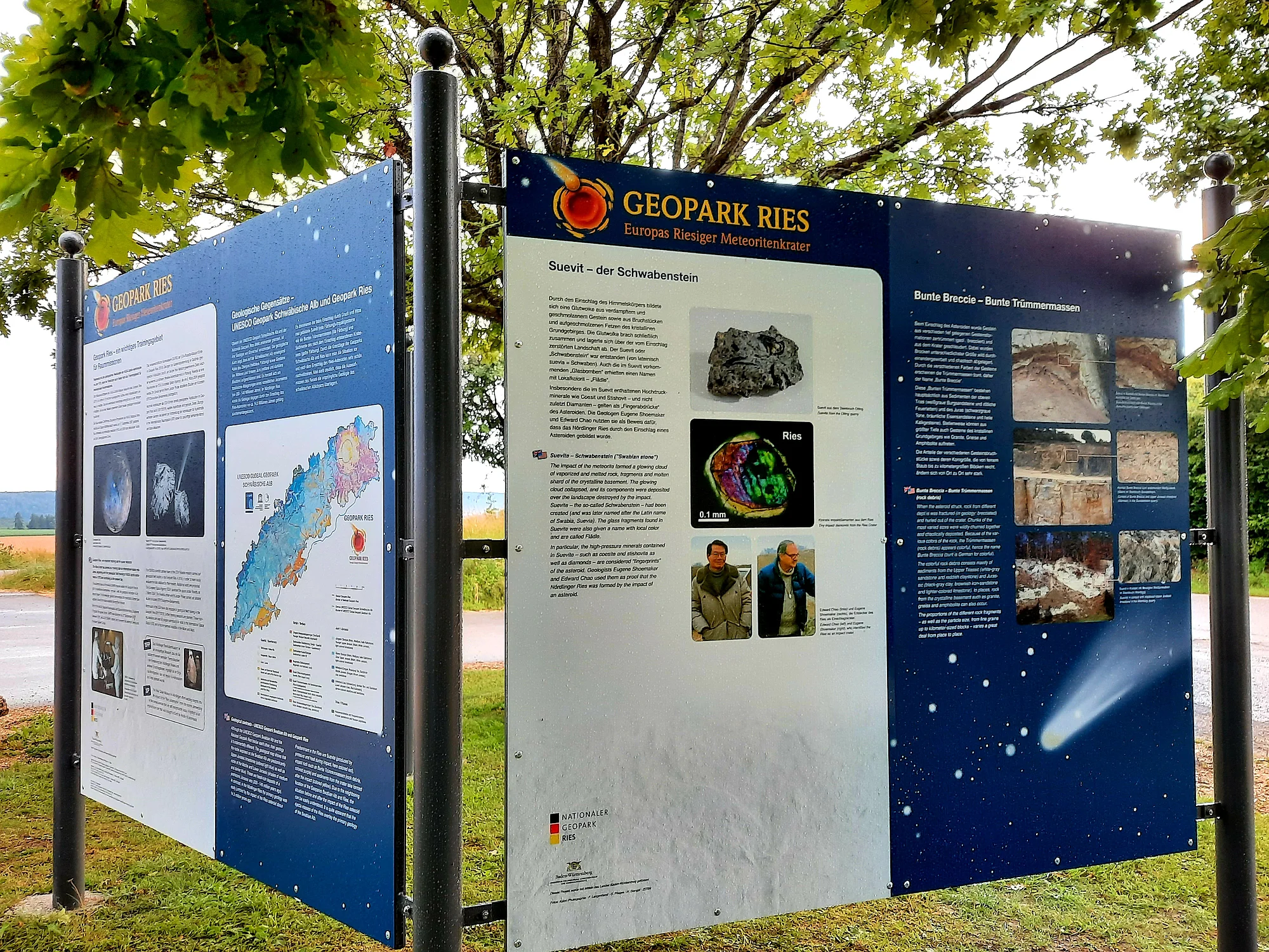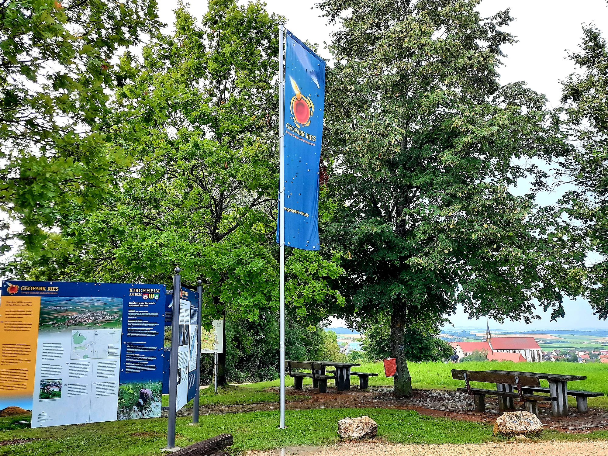 Die zweisprachige Geopark Ries Infostelle am Wanderparkplatz Riesblick, direkt am Blasienberg bei Kirchheim am Ries, begeistert mir ihrem einzigartigen Ausblick in den Rieskessel sowie auf Kirchheim am Ries. Eine geologische Karte veranschaulicht die geologischen Gegebenheiten sowohl des UNESCO Global Geoparks Ries, als auch des UNESCO Global Geoparks Schwäbische Alb.