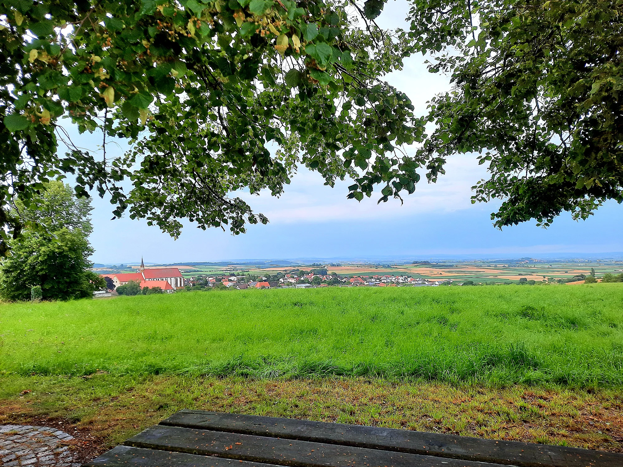 Ganz in der Nähe, an der Ruhebank auf dem Blasienberg, können die von dort weithin sichtbaren Ries-Ortschaften durch eine Panoramatafel zugeordnet werden.