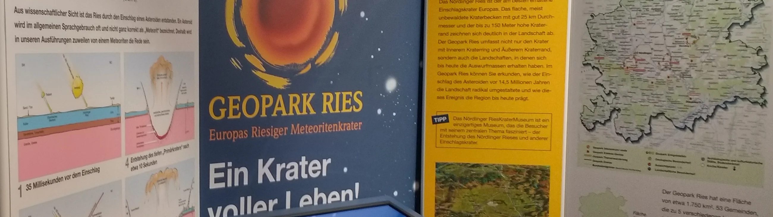 Diesem Ereignis widmet sich die Ausstellung des Geopark-Ries-Informationszentrums im Treuchtlinger Stadtschloss. Bebilderte Infotafeln vermitteln alles Wissenswerte über die Nationalen Geoparks in Deutschland, über den UNESCO Global Geopark Ries sowie die besonderen Gesteine des Kraters. Die Dauerausstellung vermittelt viel Wissenswertes über die Natur vor Ort und die natürlichen Zusammenhänge.