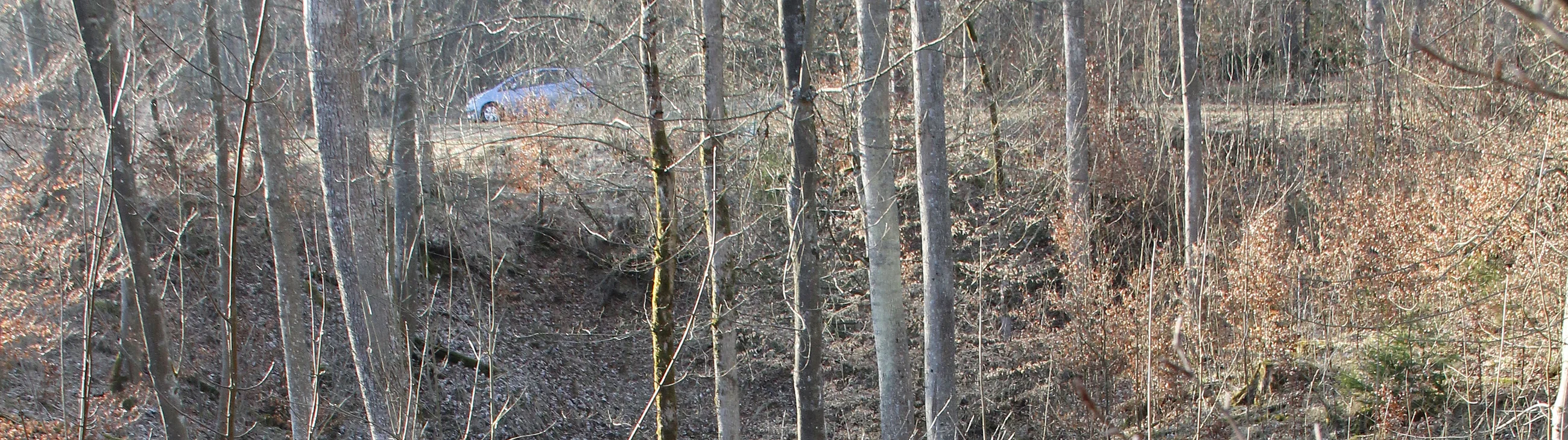 Große Trichterdoline mit Zulaufgraben im Oberjura (im Niveau der Oberen Felsenkalk-Formation, ki3, früher Weißjura epsilon). Ein frischer Nachbruch im Zentrum der etwa 10 m tiefen Doline zeigt intensive Verkarstung im Untergrund an.
