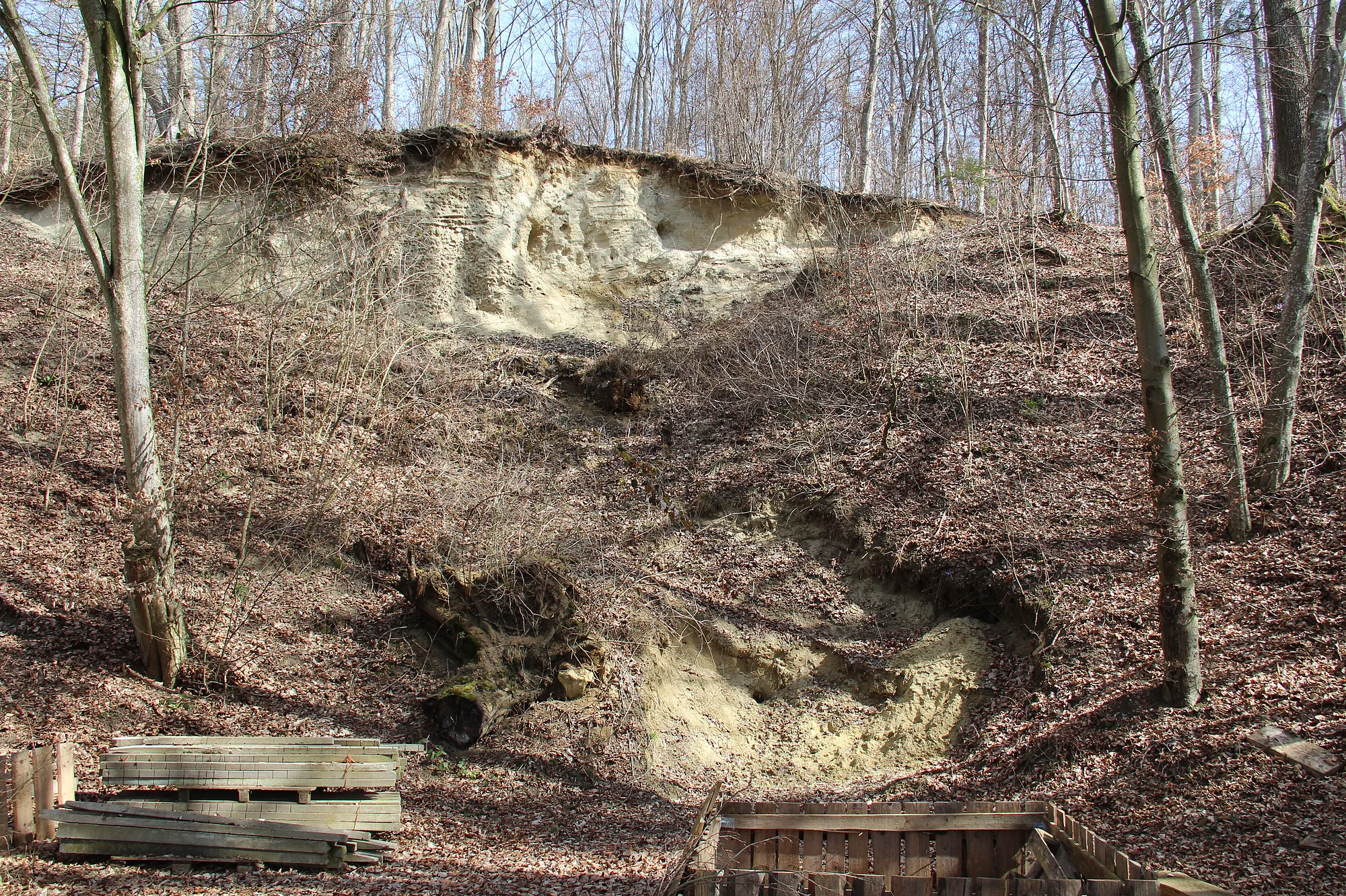 Die Ablagerungen der OMM (Obere Meeresmolasse) werden im Hangenden von Riestrümmermassen bedeckt. Die Kliffline liegt wenig nördlich der Grube.