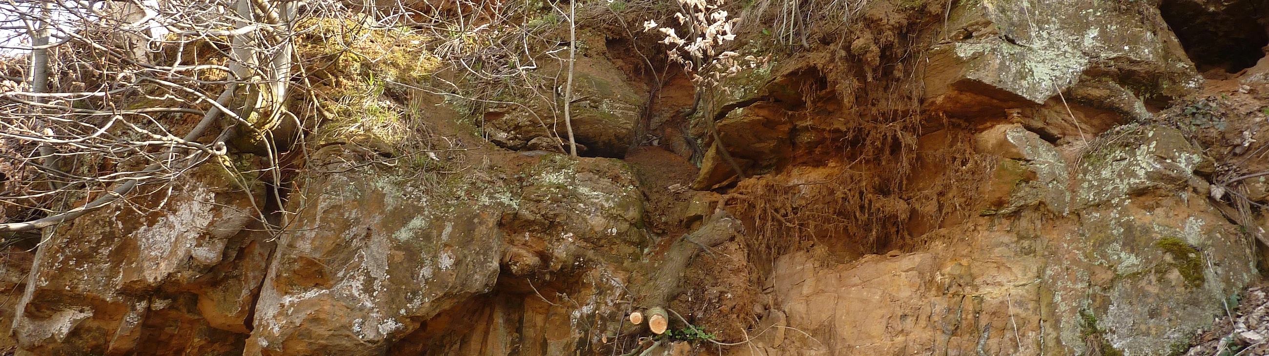 Schräggeschichteter Doggersandstein mit Eisenooidlagen ist in der ehemaligen Sandgrube direkt an der Straße aufgeschlossen.