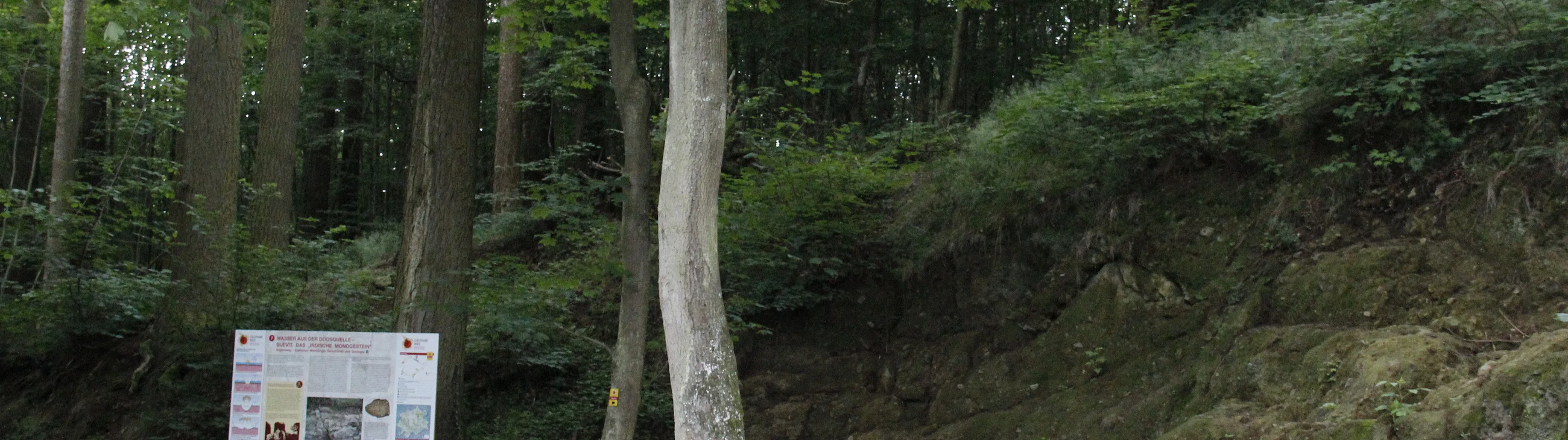 Der ehemalige Suevitbruch am Doosweiher zeigt das Gestein in leicht angewittertem Zustand. Graue, hervortretende knollige Strukturen sind kleine Glas-„Flädle“.