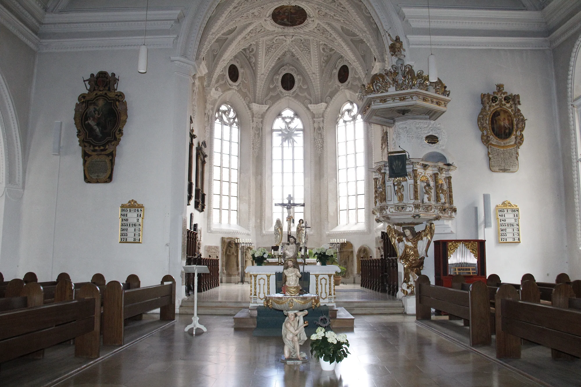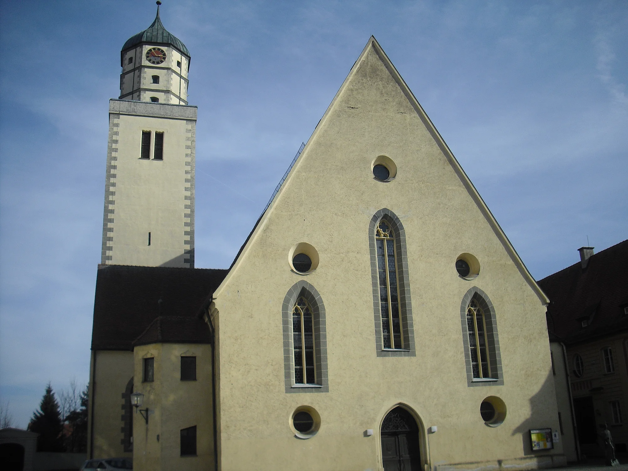 Die heute an der Kreuzung zweier Jakobus-Pilgerwege liegende Kirche wurde im Wesentlichen zwischen 1312 und 1494 erbaut und 1680/81 barockisiert. Aus dieser Zeit stammen auch die reichhaltigen Stuckaturen von Matthias Schmuzer d.J.. Erwähnenswert sind außerdem die Kreuzigungsgruppe auf dem Choraltar um 1500, der Taufstein des Oettinger Bildhauers Konrad Thier (1689) sowie die von einem Verkündigungsengel getragene Kanzel (1677). Beeindruckende Zeitzeugen sind die Grabsteine und zahlreichen Epitaphien des 15. – 18. Jh.