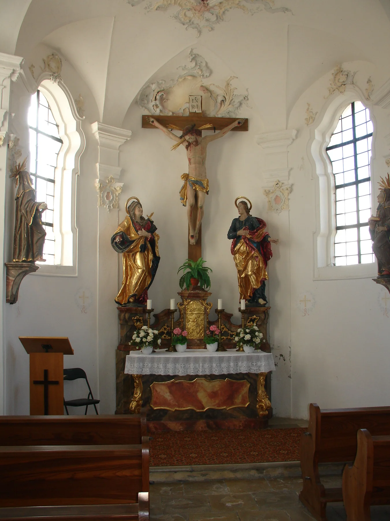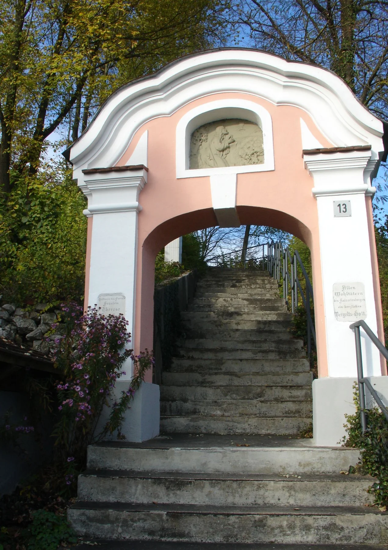 Durch das baorcke Portal, vorbei an den 1977 errichteten Stationen des Kreuzweges, erreicht man das hoch über der Wörnitz gelegene Kleinod. Die Kapelle wurde 1750 unter Abt Cölestin zu Kaisheim mit ovalem Grundriss erbaut. Besonders sehenswert sind der Altar mit Kreuzigungsgruppe und das von Gernhard Göz geschaffene Deckenbild, das die Schlüsselübergabe an Petrus zeigt.
