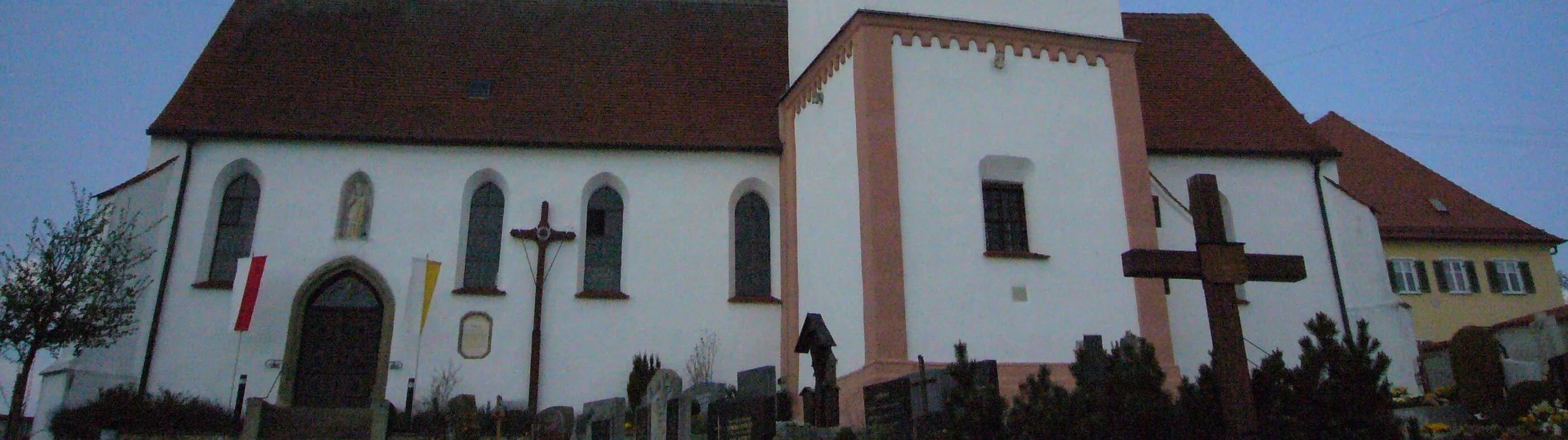 Der Turmunterbau ist romanisch, das Glockengeschoss um 1340 entstanden. Chor und Langhaus wurden 1656 errichtet und 1907 nach Westen verlängert. Im Inneren beeindrucken kraftvolle Wessobrunner Stukkaturen (1695) von Johann Schmuzer und die Altäre aus den Jahren 1670/80. Außerdem sehenswert ein Epitaph für Sixtus Gundelsheim (gest. 1483) mit fast vollplastischem Ganzfigurenportrait.