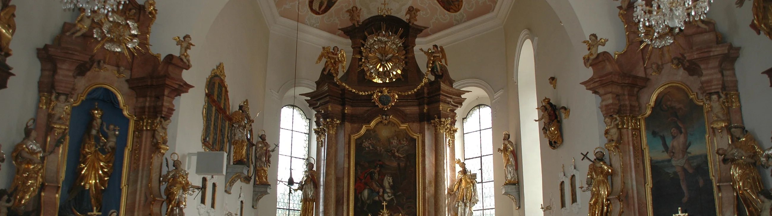 Die heutige Kirche wurde 1729/30 durch den Deutschordensbaumeister Franz Joseph Roth teilweise auf romanischen Fundamenten erbaut. Fresken und Hochaltarblatt stammen aus der gleichen Zeit von Johann Michael Zink, die Seitenaltarfiguren aus der Werkstatt von Johann Georg Bschorer. Prächtige Kanzel um 1736 sowie wertvolle spätgotische Marienfigur aus Holz um 1480.