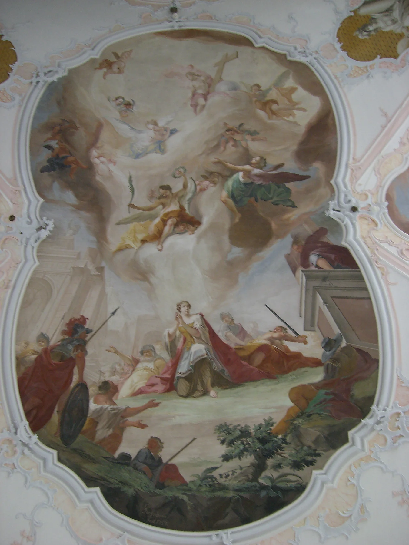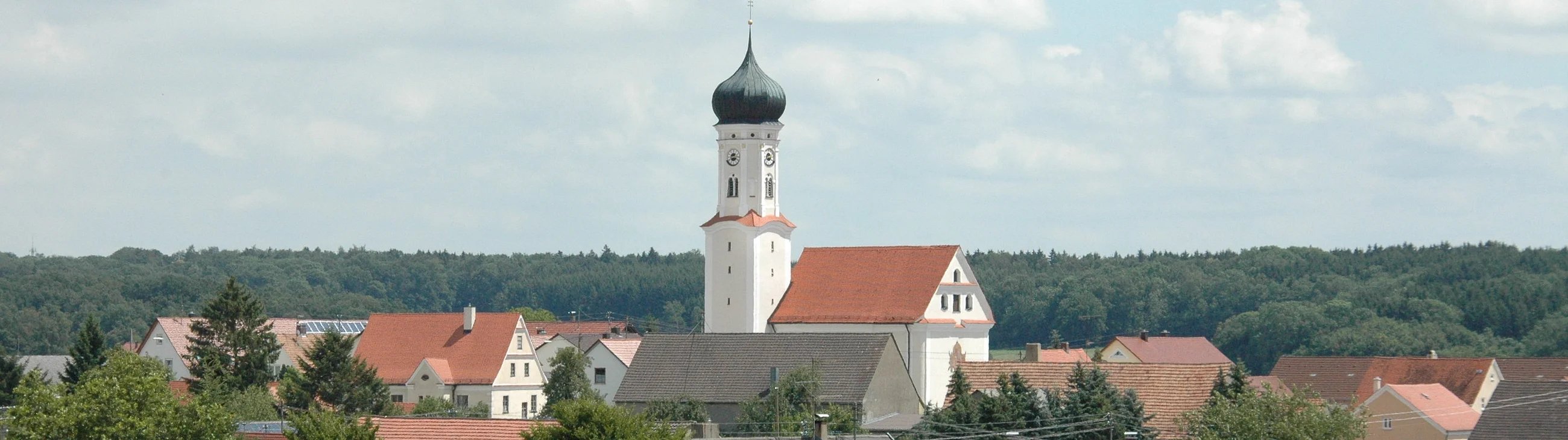 Der Kaisheimer Abt Cölestin I. Meermoos ließ den für die dörflichen Verhältnisse stattlichen, einschiffigen Bau unter Verwendung des spätgotischen Turmuntergeschosses um 1756/57 im reinsten Stil der Zeit errichten und ausstatten. Besonders erwähnenswert sind die eleganten Stukkaturen, prächtigen Deckenfresken sowie die klassizistischen Hoch- und Seitenaltäre mit Gemälden von Johann Baptist Enderle.