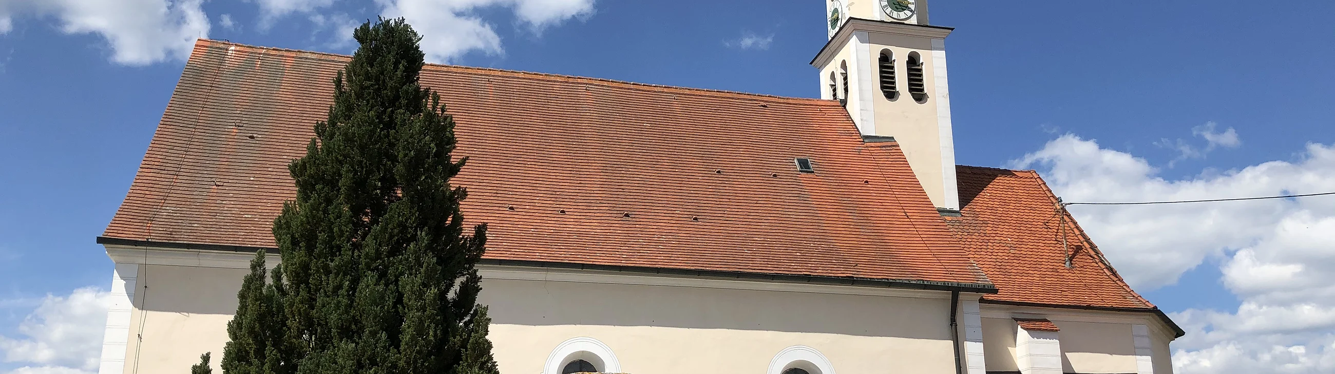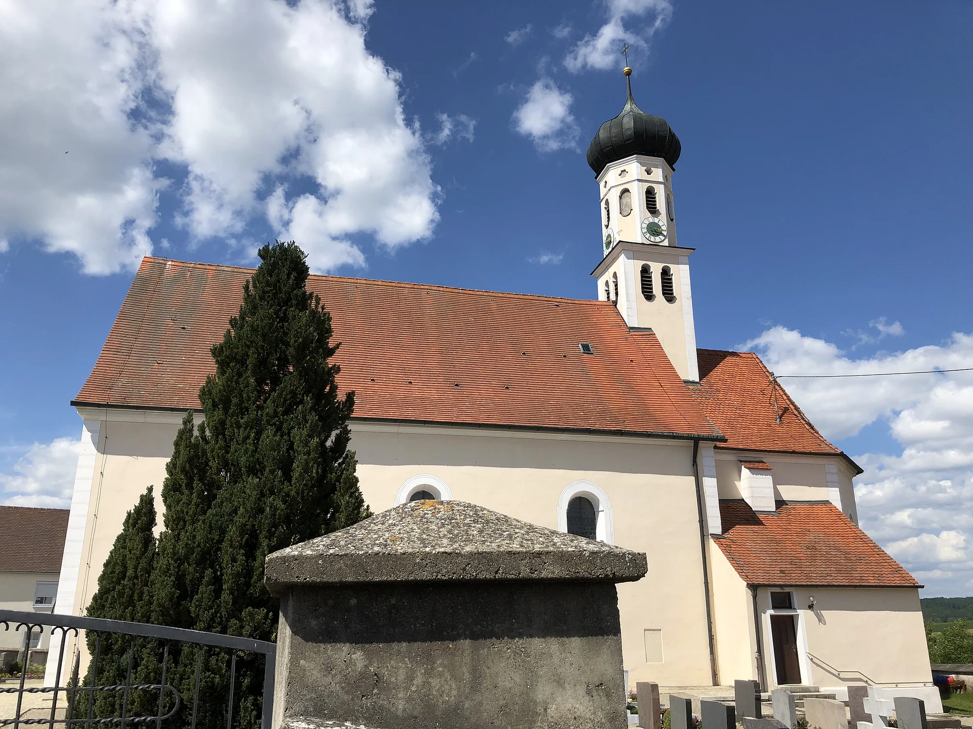 Nach Abbruch des alten Langhauses 1737 wurde das jetzige neu erbaut und die Kirche 1743 geweiht. Gegenüber der Kanzel befindet sich ein Kruzifix aus der Mitte des 18. Jh. Am Westgiebel ist das Wappen des Abtes Rogerius Friesl aus Kaisheim zu sehen. Um die Pfarrkirche ist ein Friedhof angelegt.