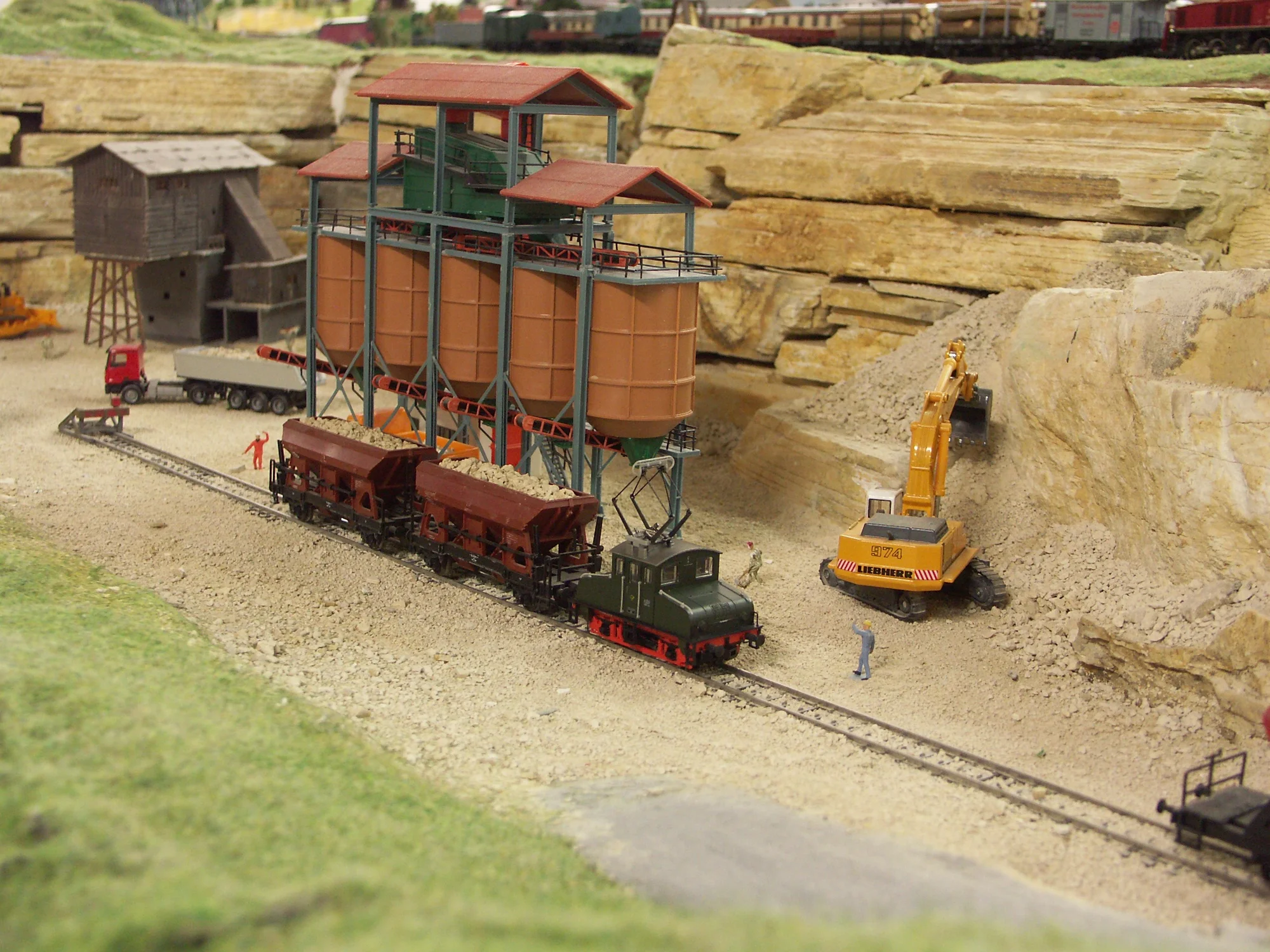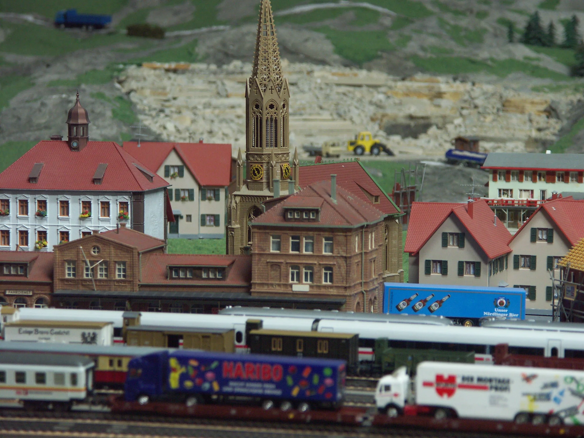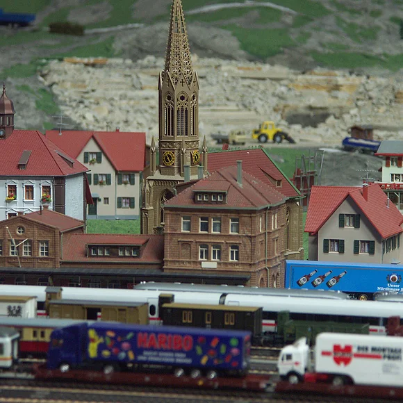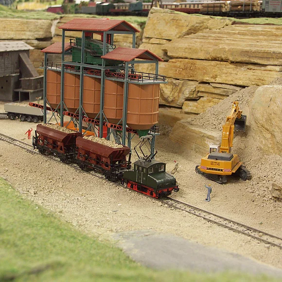 Neben Bauernhöfen, einer Gärtnerei, Steinbrüchen, dem Kohlebergwerk, dem Bergmassiv mit Seilbahnen, einem Weinberggebiet, Zoo und Rummelplatz ist auch viel Technik zu sehen. Alles ist mit viel Liebe zum Detail gestaltet: In einem großen Steinbruch und Schotterwerk werden zum Beispiel zwei Dinosaurierfunde von Archäologen mit präziser Feinarbeit freigelegt, auf einem Friedhof der Klosterkirche findet eine Beerdigung statt und auf dem Festplatz drehen sich viele bewegliche Fahrgeschäfte. Finden Sie das Liebespaar hinter dem Felsen?