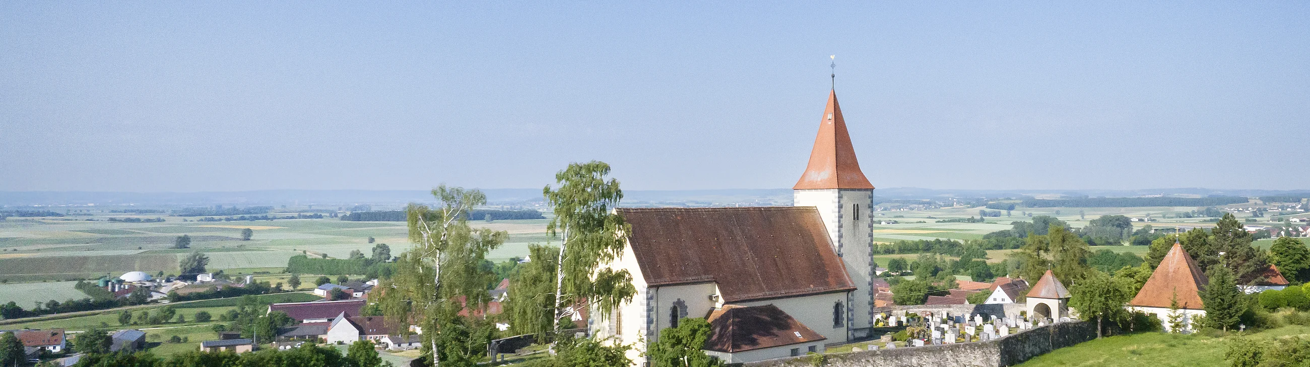Eine der Urpfarreien der Gegend und eine der letzten Simultankirchen Bayerns in erhobener Lage mit Blick ins Ries. Wuchtiger annähernd quadratischer Westturm mit Zeltdach (um 1180). Langhaus wahrscheinlich aus dem 13. Jahrhundert, Chor Ende 15. Jahrhundert. Das gefasste Holzkruzifix aus dem frühen 13. Jahrhundert ist das älteste dieser Art im Ries.