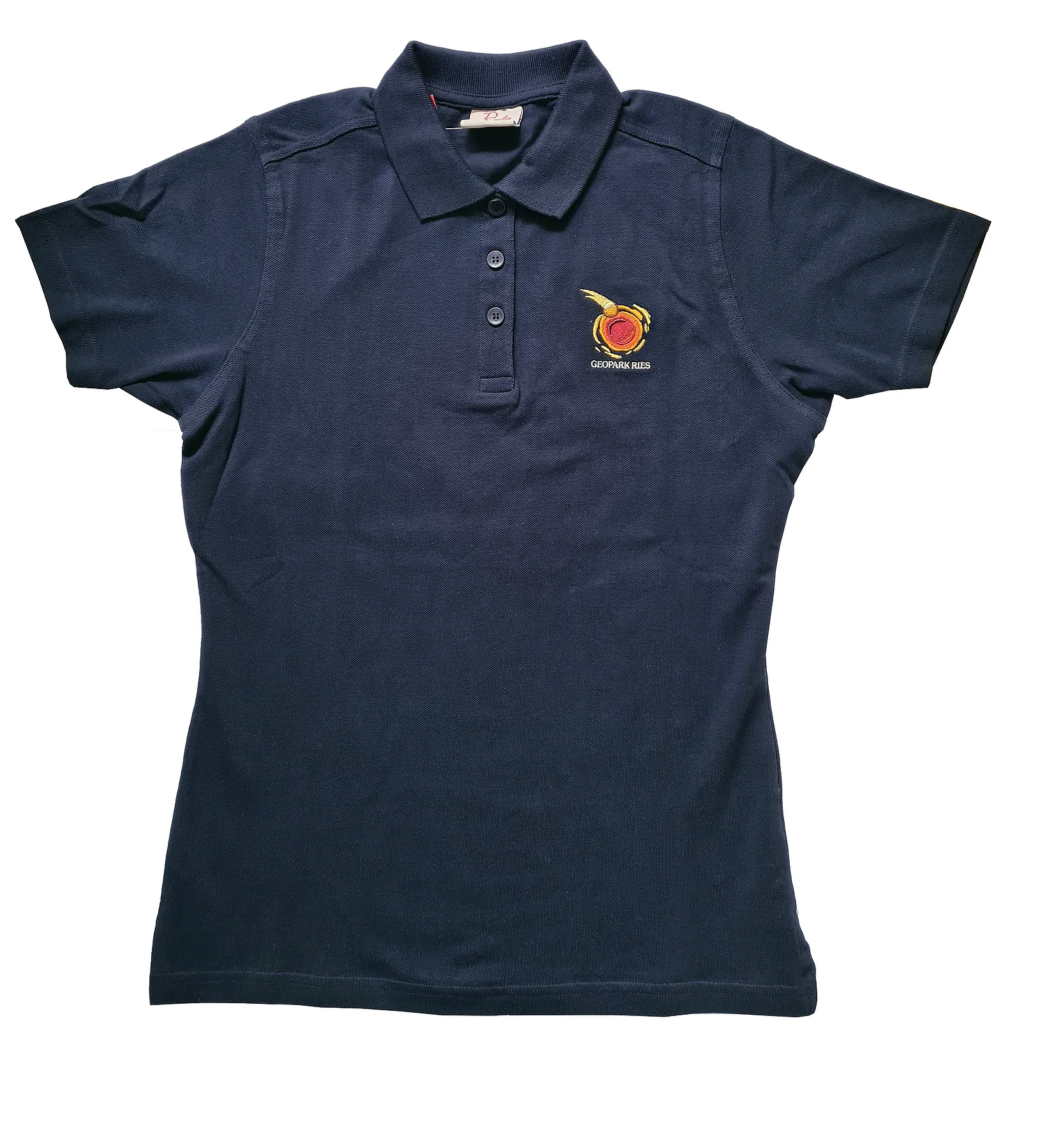 Ein dunkelblaues Poloshirt hat auf Brusthöhe das Logo des Geopark Ries aufgestickt.