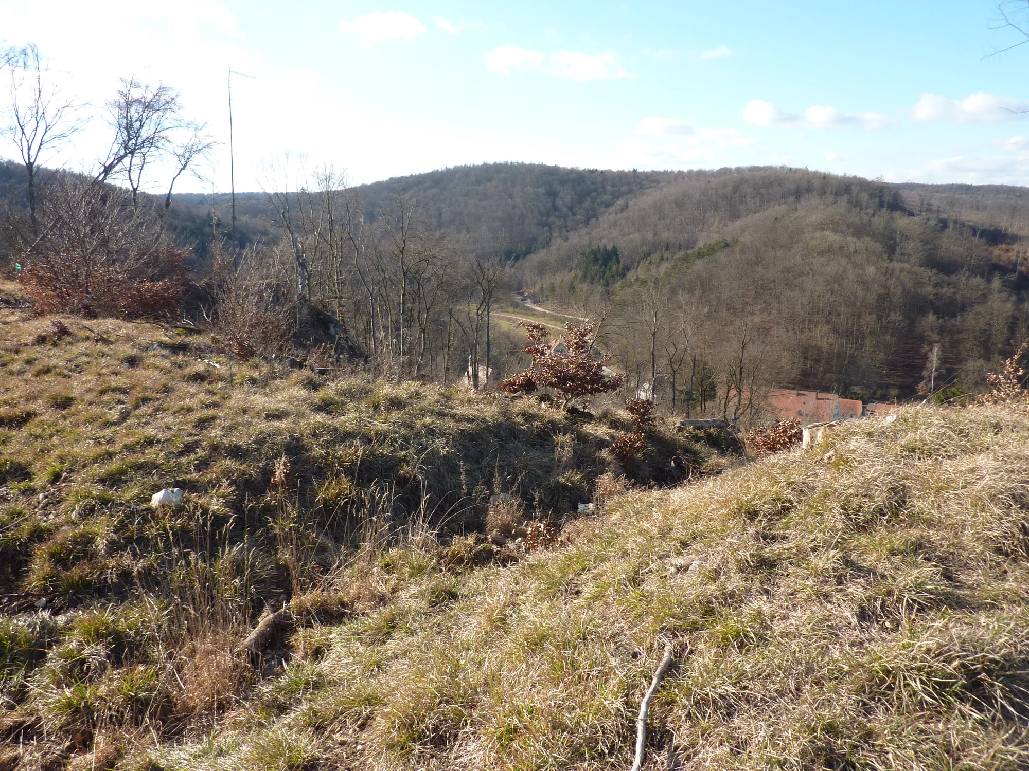 Vom Steilabfall des Berges schwingt halbkreisförmig ein Wall mit vorgelagertem Graben nach Westen, um sich nach ca. 70 m wieder an den Abhang anzulehnen. In ihm sitzt eine 2,2 m starke Trockenmauer. Dem Wall ist ein Graben vorgelagert. Bei einer Ausgrabung im Jahr 1919 wurden mittelalterliche Scherben geborgen. Die kleinen Schanzen gehören in eine Zeit, als die großen Fluchtburgen bereits außer Funktion gekommen waren. Seit dem 11. Jh. treten an ihre Stelle die befestigten Kirchhöfe in den Dörfern oder kleine Rundwälle am Rande der Ortschaften. An die Stelle einer großräumig organisierten Sicherung traten nun Zufluchtsplätze für einzelne Ansiedlungen. Es scheint am naheliegensten, in diesen Befestigungen Kleinfluchtburgen zu sehen, in die die Bewohner der unterhalb am Bach liegenden Hoppelmühle und des Christgartenhofes sich mit ihrer Habe bei Gefahr flüchteten.