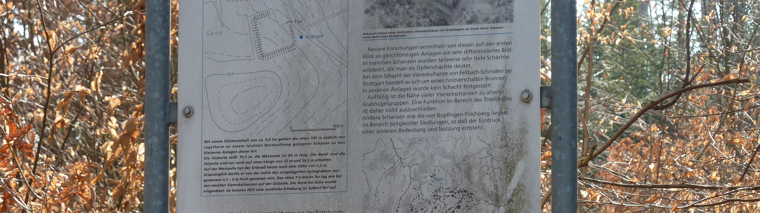 Die recht gut erhaltene, nicht genau Nord-Süd orientierte quadratische Viereckschanze von Jagstheim liegt im Buchenhochwald. Auf der West- und Nordseite folgt der Waldrand dem Verlauf von Wall und Graben. Länge der Westseite 84 m, der Südseite 70 m, der Ostseite noch 56 m. Der Nordwall ist heute noch deutlich zu sehen und besitzt eine Höhe von etwa 1,5 m. Die in Süddeutschland sehr zahlreichen und mit zu den eindrucksvollsten Bodendenkmälern zählenden Viereckschanzen sind keltische Heiligtümer aus dem ersten vorchristlichen Jahrhundert. Die Bedeutung dieser Anlagen war trotz ihres häufigen Vorkommens lange nicht bekannt. Neben kleinen tempelartigen Holzbauten im Innenraum sind besonders die bis zu 35 m tiefen Kultschächte zu erwähnen. Hölzerne Pfähle und organische Materialien sind wohl als Opferreste anzusehen und fanden sich in fast allen Schächten. Die Viereckschanze von Jagstheim gehört in eine Gruppe von Anlagen, die sich im Umkreis des Ipf, als keltische Befestigung, konzentrieren. Es ist anzunehmen, dass zwischen diesen ähnlich alten Anlagen ein innerer Bezug besteht. Besonders beeindruckt die südwestliche Ecke der Jagstheimer Schanze. Die für keltische Schanzen charakteristische Überhöhung der Ecken ist hier besonders gut erkennbar. Von der Grabensohle bis zur Wallkrone hat die Schanze hier noch eine Höhe von etwa 2,5 m. Das einzige antike Tor in das Innere der Schanze liegt in der Mitte der Ostseite und besitzt eine Breite von etwa 7 m. Weiter nach Norden ist der Wall nur noch undeutlich bis zum Waldrand erkennbar. Aufgrund anderer Untersuchungen müssen wir annehmen, dass im Bereich des Tores in keltischer Zeit ein aus Holz errichteter Torbau bestand. Das Innere der keltischen Viereckschanze ist etwa um einen Meter höher als das Niveau außerhalb der Schanze. Für die Deutung der Viereckschanzen ist hier besonders die topographische Situation bezeichnend: Von einer Anhöhe unmittelbar südwestlich der Schanze kann die gesamte Anlage innen wie aussen überblickt werden. Dies scheint ein untrüglicher Beweis dafür zu sein, dass derartige Viereckschanzen keinen militärischen Charakter haben können.