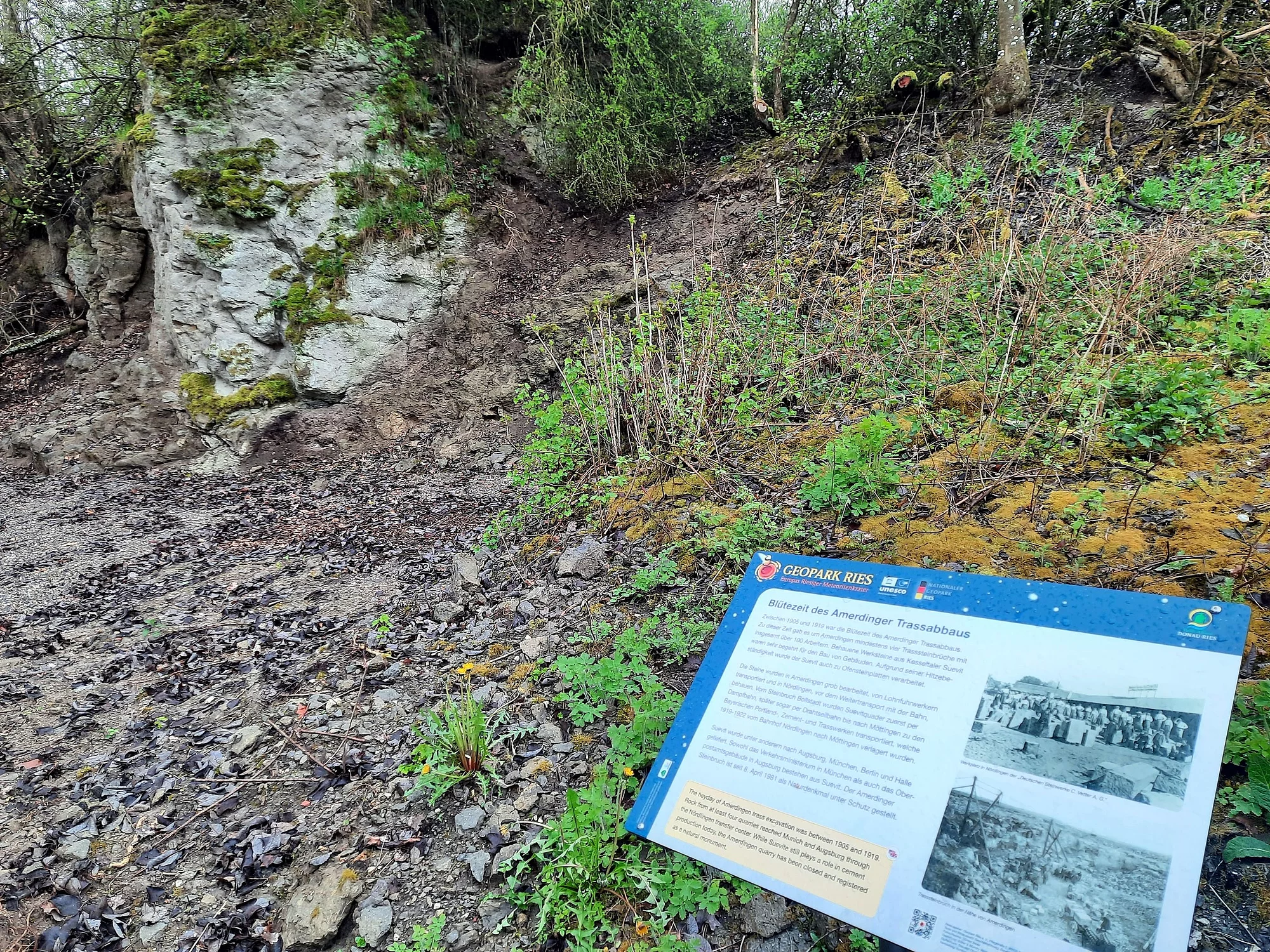 Drei Tafeln entlang des kurzen Lehrpfads erläutern Wissenswertes über Geologie, Biologie und Geschichte des Geotops als ehemaligen Suevit-Steinbruch.